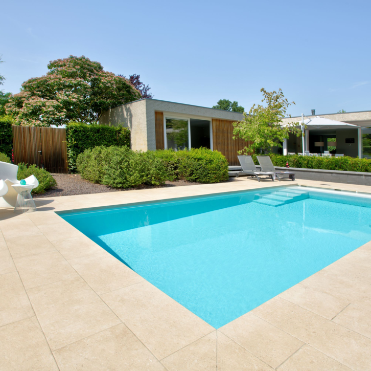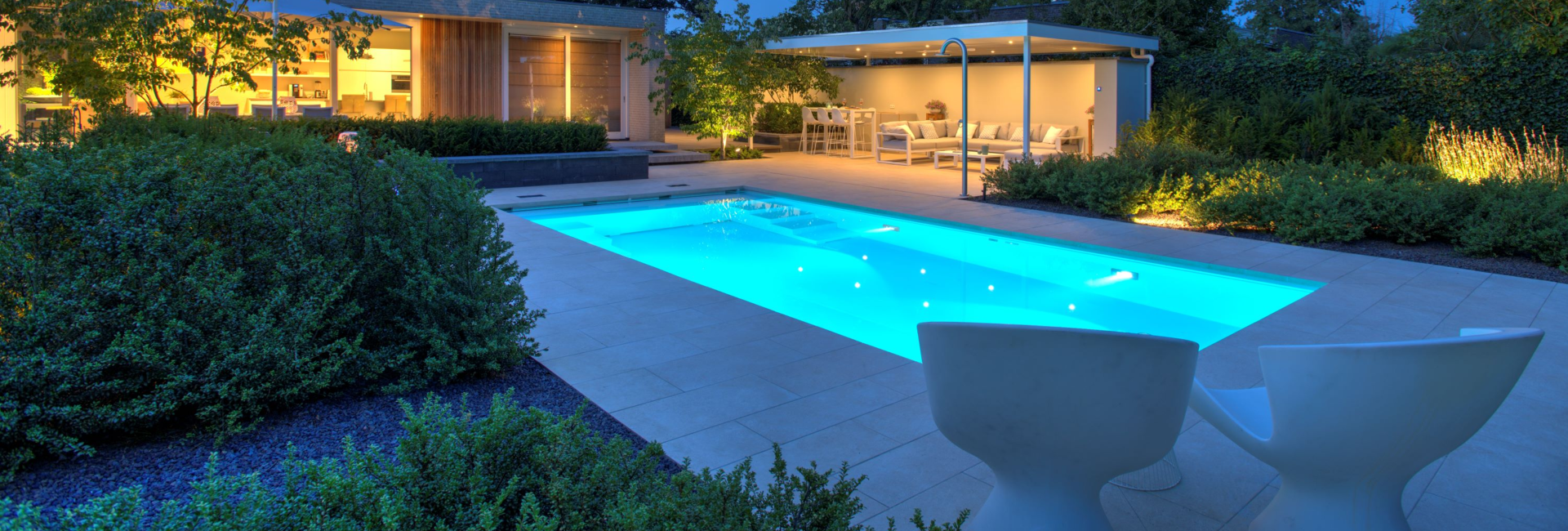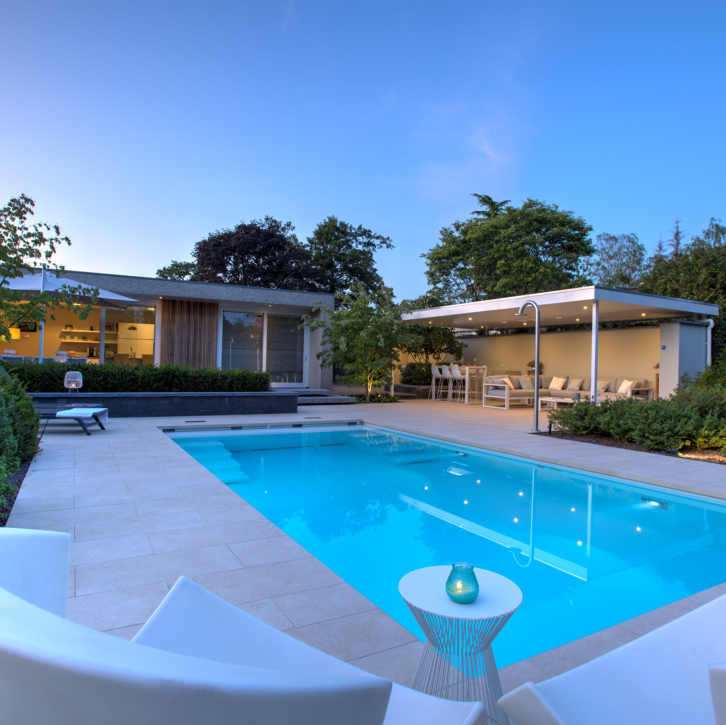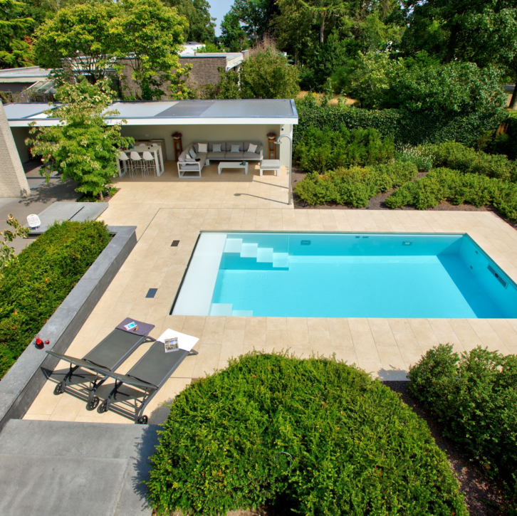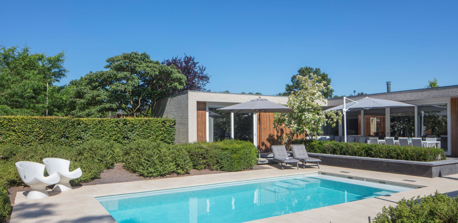 Dit prachtige 8 meter zwembad is het middelpunt van deze diverse tuin. Ondanks dat deze tuin in een dorp gelegen is, geeft het rust en ruimte.