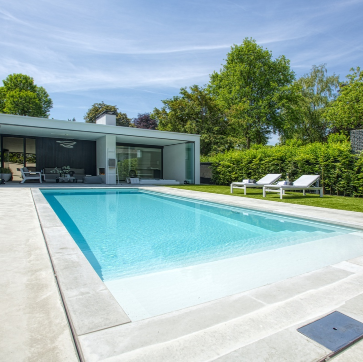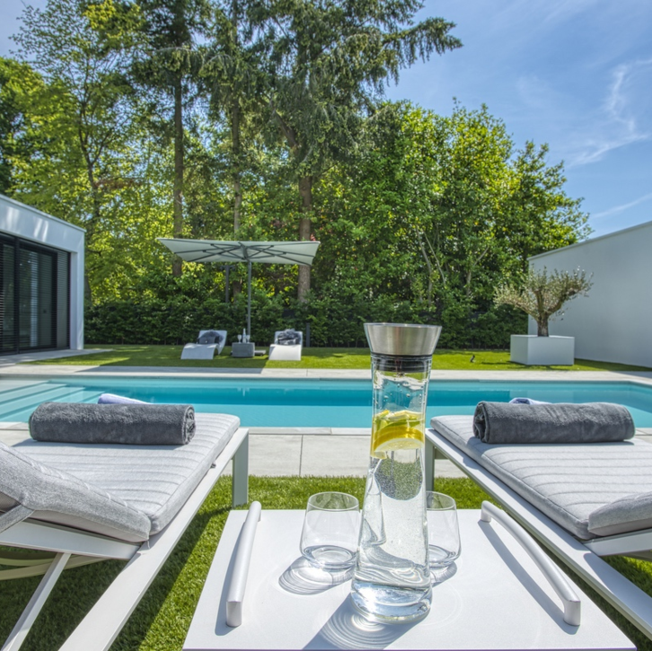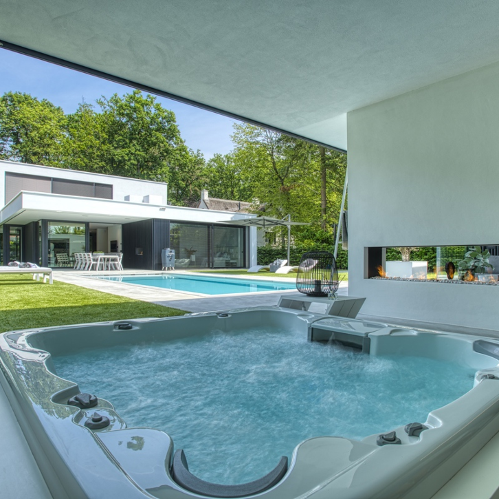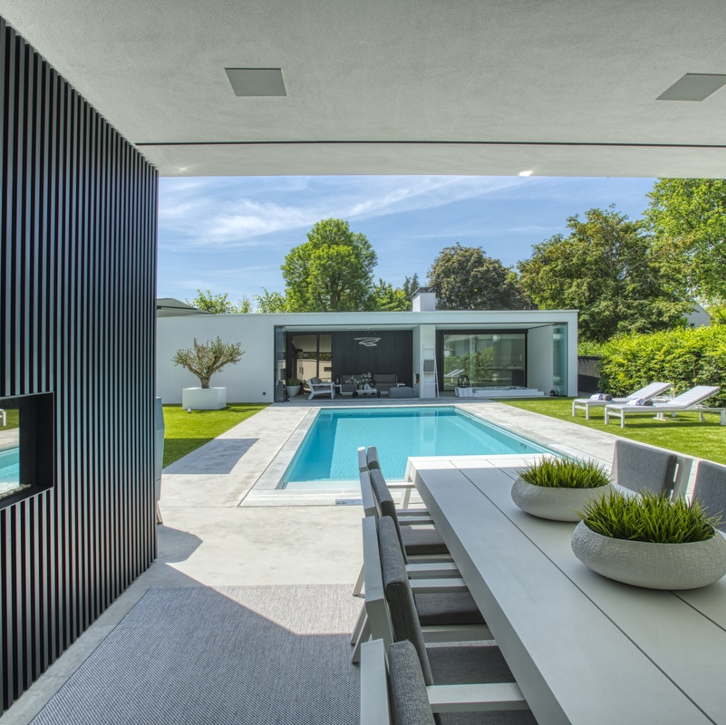 Deze Nova Line is het middelpunt in de tuin van deze moderne villa. Samen met de ingebouwde spa welke overdekt ligt kan je 365 dagen per jaar genieten van de elementen in deze tuin.